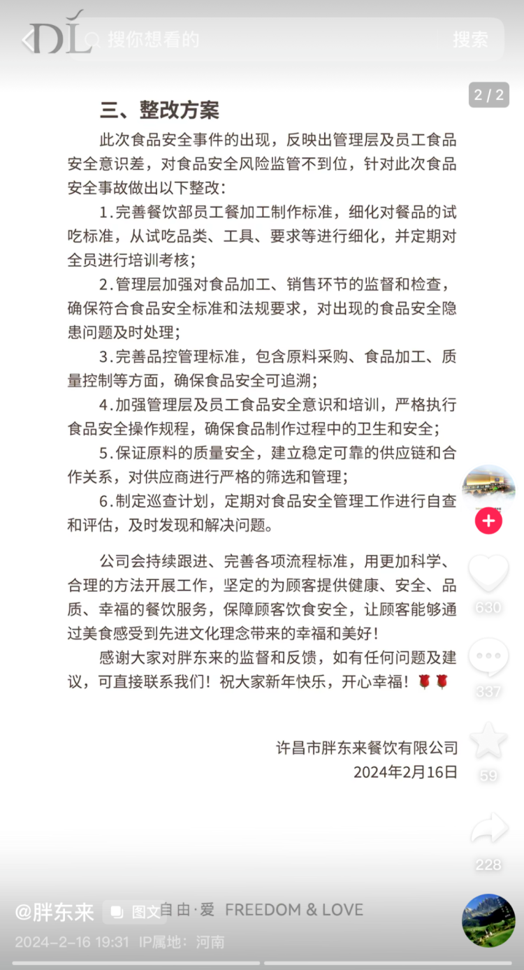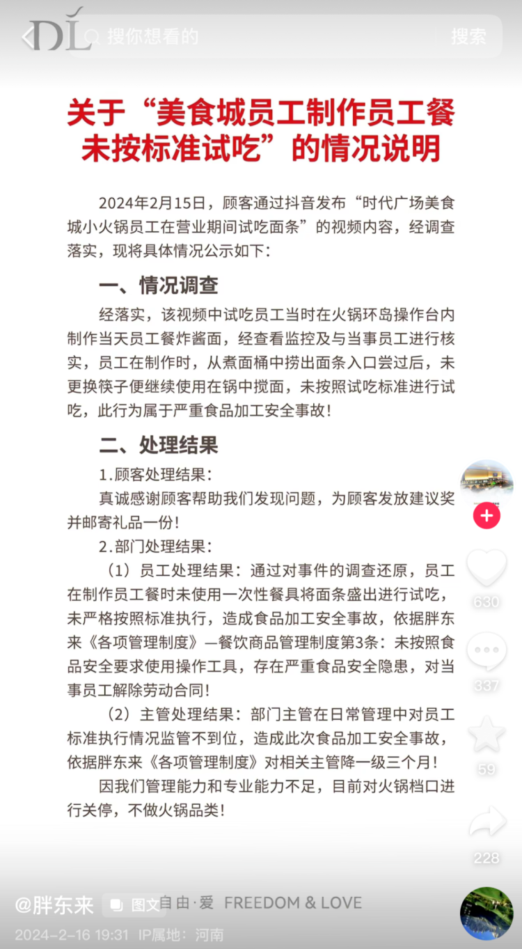 2月16日19时30分许,胖东来发布关于“美食城员工制作员工餐未按标准试吃”的情况说明。声明称:该视频中试吃员工当时在火锅环岛操作台内制作当天员工餐炸酱面,经查看监控及与当事员工进行核实,员工在制作时,从煮面桶中捞出面条入口尝过后,未更换筷子便继续使用在锅中搅面,未按照试吃标准进行试吃,此行为属于严重食品加工安全事故。
