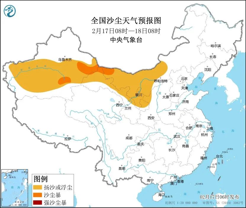受冷空气大风影响,预计2月17日8时至18日8时,新疆东部和南疆盆地、内蒙古中西部、甘肃北部、宁夏大部、陕西西北部等地的部分地区有扬沙或浮尘天气,新疆东部和南疆盆地东南部、内蒙古西部、甘肃北部等局地有沙尘暴。中央气象台2月17日6时继续发布沙尘暴蓝色预警。