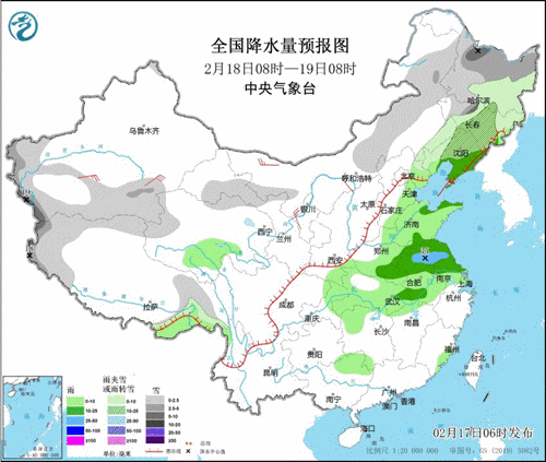 2月18日至22日,中东部地区将出现大范围雨雪天气。内蒙古中东部、东北地区、西北地区东部、华北大部、黄淮、江淮、江汉、江南北部和西部及贵州等地将先后出现雨转雨夹雪或雪,东北、华北、黄淮等地的部分地区有大到暴雪,局地大暴雪;黄淮南部、江淮、江南中北部等地有中到大雨,局地暴雨,并伴有雷暴、短时强降水等强对流天气。