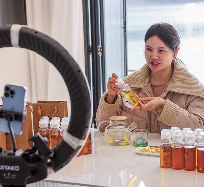 浙江省杭州市淳安县一家民宿内,主播在进行“淳蜜共富”主题网络直播。作为“高质量发展建设共同富裕示范区”,浙江推出各种政策促进城乡均衡发展。新华社记者 徐 昱摄