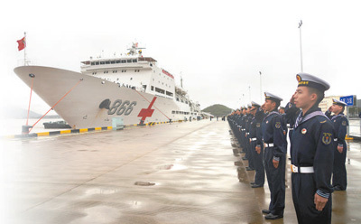 执行“和谐使命—2022”任务的中国海军“和平方舟”号医院船返回浙江舟山某军港,任务部队官兵代表在码头迎接。“和平方舟”号医院船是我国自主设计建造的首艘制式远洋医院船。自2008年入列以来,该船以“和谐使命”任务为主要载体,多次远赴海外开展人道主义医疗服务。孙 飞摄(新华社发)
