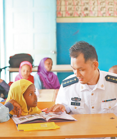 中国人民解放军驻吉布提保障基地官兵与吉小学生交流。中国军队在吉布提建设保障基地,是中吉两国政府经过友好协商作出的决定,为中国军队执行护航、维和任务等提供有力保障。30多年来,我国已派出维和人员5万余人次,赴20多个国家和地区参加联合国维和行动。王宗洋摄(影像中国)