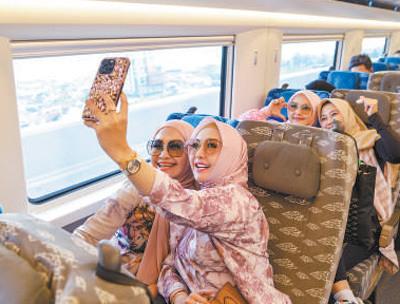 乘客在行驶中的雅万高铁车厢内拍照。作为“一带一路”倡议和中印尼两国务实合作的标志性项目,雅万高铁全线采用中国技术、中国标准。新华社记者 徐 钦摄