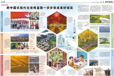 以中国式现代化全面推进强国建设、民族复兴伟业,是全党全国各族人民在新时代新征程的中心任务。当前,我国高质量发展扎实推进,现代化产业体系更加健全,研发人才数量全球第一,技能人才总量超2亿人,粮食生产“二十连丰”,脱贫攻坚成果持续巩固拓展,推进乡村全面振兴不断取得实质性进展、阶段性成果,城乡居民安居乐业,新时代文明实践中心遍地开花,森林覆盖率超24%,绿水青山成色更足,与150多个国家、30多个国际组织签署200多份共建“一带一路”合作文件……一组组亮眼的数字,映照出一个历史悠久、文明博大的中国,一个活力满满、热气腾腾的中国,奋进在强国建设、民族复兴的新征程上。
