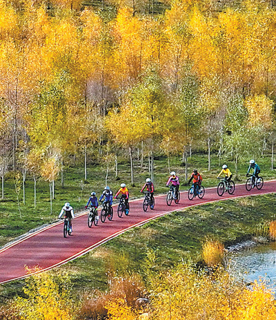 甘肃省张掖市奥林匹克森林公园,骑行爱好者们骑行穿过胡杨林。张掖市推进绿化工程,乱石滩“变身”森林公园,成了市民健身休闲的理想之所。王 将摄(影像中国)