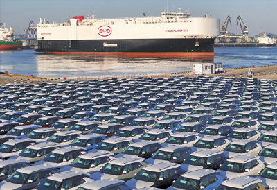 中国首艘由国内船企建造、专门用于国产新能源汽车出口的汽车运输船“比亚迪开拓者1号”搭载新能源汽车从山东烟台港启航。2023年,中国新能源汽车产销量均突破900万辆,其中出口120.3万辆,同比增长77.6%,成为经济高质量发展中的一抹亮色。唐 克摄(影像中国)
