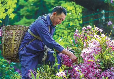 四川省泸州市合江县福宝镇种植基地,村民在采摘金钗石斛鲜花。各地发展绿色生态农业,积极打造特色农产品优势品牌,助推乡村全面振兴。李贵平摄(影像中国)