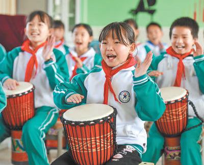 江西省樟树市义成镇中心小学学生在练习乐器演奏。目前,我国基础教育普及水平总体达到世界中上行列。周 亮摄(影像中国)