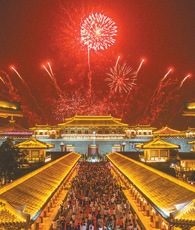 游客们在湖北省襄阳市唐城景区看烟花秀。当地举办的戏曲文化艺术节吸引了众多省内外游客前来,拉动当地旅游经济。据统计,2023年国内出游人次达48.91亿,国内游客出游总花费4.91万亿元。杨 东摄(影像中国)