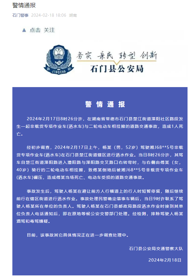 经初步调查,2024年2月17日上午,杨某(男,52岁)驾驶湘J68**5号非载货专项作业车(洒水车)在石门县楚江街道辖区进行洒水作业。当日8时26分许,其驾车自楚江街道渫阳路进入澧阳路与渫阳路交叉路口右转弯时,与右侧由傅某(女,40岁)骑行的二轮电动车相挂擦,致傅某倒地后被湘J68**5号非载货专项作业车(洒水车)碾压,造成傅某当场死亡、电动车受损的道路交通事故。