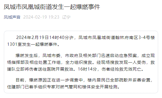 2024年2月19日14时40分许,凤城市凤凰城街道翰林府南区3-4号楼1301室发生一起爆燃事件。