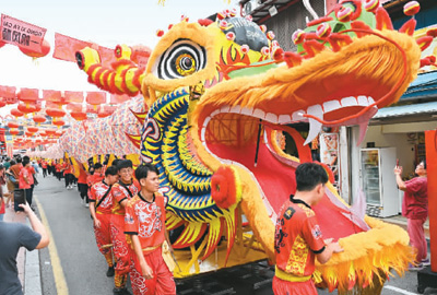 龙年春节,由马来西亚和中国青少年组成的队伍在马来西亚马六甲市鸡场街上共舞一条近二百米的“长龙”。