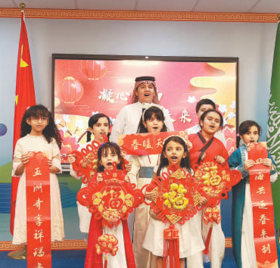 2月1日,在沙特阿拉伯智慧宫中文教育学院吉达学院,孩子们用中文合唱歌曲《新年好》。