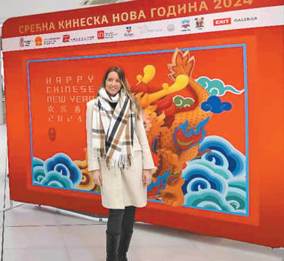 1月30日,在塞尔维亚诺维萨德,一位女士在“欢乐春节”活动展板前留影。
