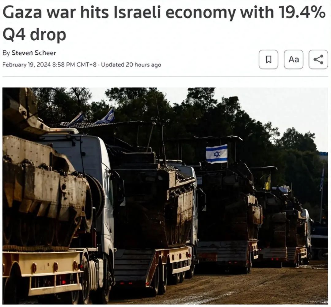 综合《以色列时报》和路透社报道,以色列中央统计局当地时间2月19日公布的数据显示,以色列经济在2023年第四季度萎缩了近五分之一,原因是以方在加沙地带开展的军事行动严重打击了消费者支出、贸易和投资。