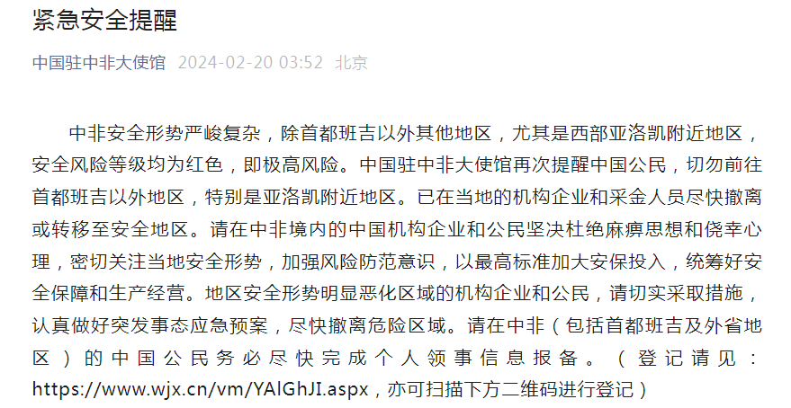 中非安全形势严峻复杂,除首都班吉以外其他地区,尤其是西部亚洛凯附近地区,安全风险等级均为红色,即极高风险。中国驻中非大使馆再次提醒中国公民,切勿前往首都班吉以外地区,特别是亚洛凯附近地区。已在当地的机构企业和采金人员尽快撤离或转移至安全地区。请在中非境内的中国机构企业和公民坚决杜绝麻痹思想和侥幸心理,密切关注当地安全形势,加强风险防范意识,以最高标准加大安保投入,统筹好安全保障和生产经营。地区安全形势明显恶化区域的机构企业和公民,请切实采取措施,认真做好突发事态应急预案,尽快撤离危险区域。请在中非(包括首都班吉及外省地区)的中国公民务必尽快完成个人领事信息报备。(登记请见:https://www.wjx.cn/vm/YAlGhJI.aspx)