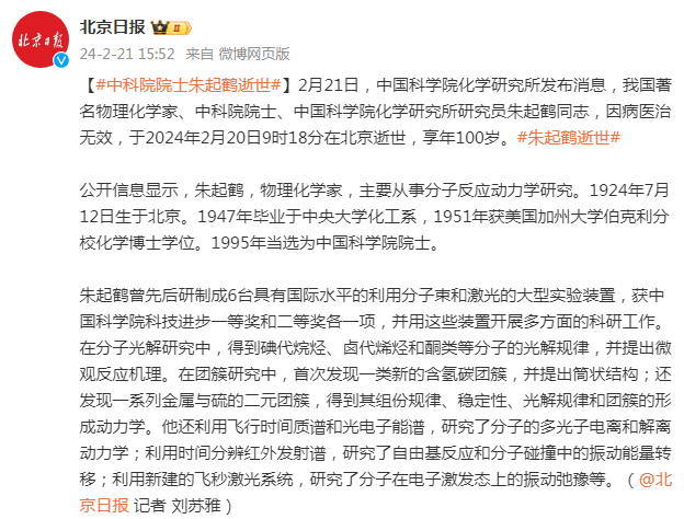 2月21日,中国科学院化学研究所发布消息,我国著名物理化学家、中科院院士、中国科学院化学研究所研究员朱起鹤同志,因病医治无效,于2024年2月20日9时18分在北京逝世,享年100岁。