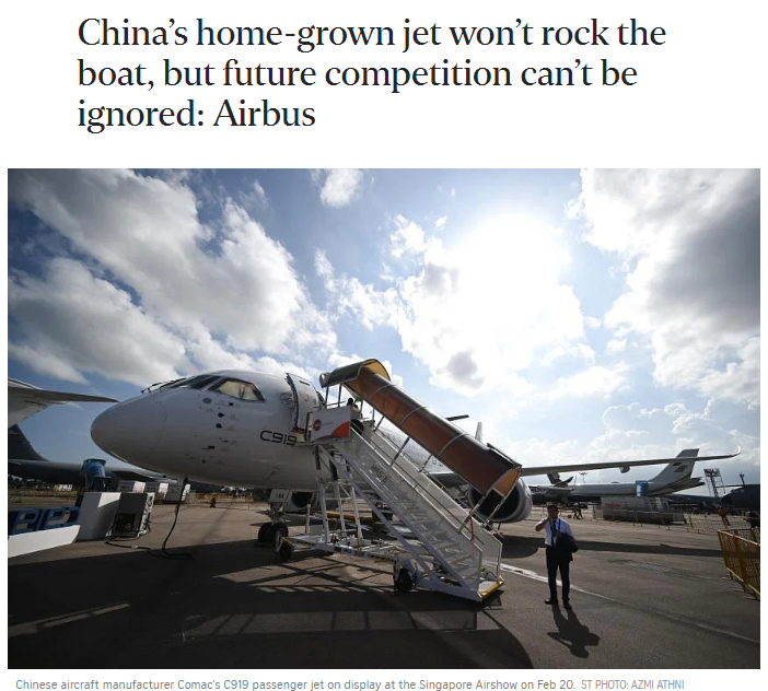 在2月20日开幕的新加坡航展上,中国商飞参展的C919和ARJ21飞机引发了不小热度。美国波音公司表示,它“正准备与中国第一款国产大型客机竞争”,欧洲飞机制造商空中客车也强调,不能忽视中国飞机制造商给航空业带来的竞争。