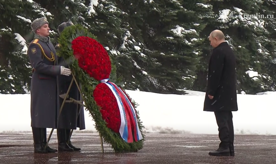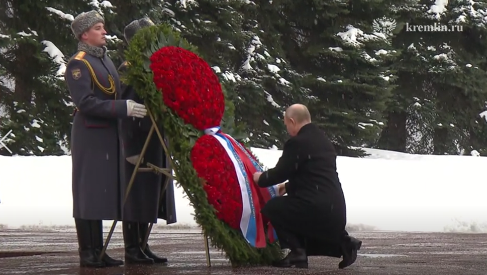 综合俄罗斯红星电视台、塔斯社报道,在敬献花圈仪式上,总统卫队的士兵把花圈安放到无名烈士墓的长明火前,普京上前整理写有“俄罗斯总统献给无名烈士”字样的红蓝白三色缎带,随后低头默哀。