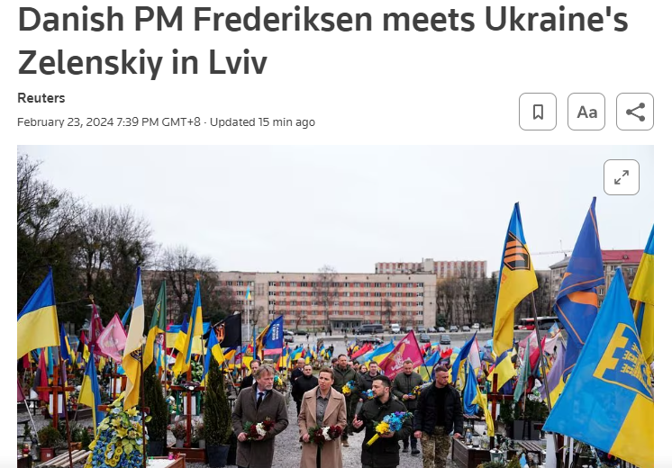 报道称,弗雷德里克森23日在乌克兰西部城市利沃夫会见了泽连斯基。乌克兰总统办公室说,泽连斯基与弗雷德里克森一同参观了一个乌军墓地,并向阵亡的士兵致敬。泽连斯基在社交平台X上说:“我们永远不会忘记捍卫我们独立、自由和未来的英雄们。”