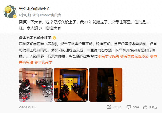 “半穷不穷的小杆子”曾在2020年8月发博反映明尚西苑小区电动车充电问题,其写道“明尚西苑小区2栋架空层充电位置不够,没有照明,单元门里很多电动车,还有电动车上电梯充电,多次和街道物业反映,一直再(在)想办法,从年头开始到现在没有动静。天热车多,有失火隐患。”