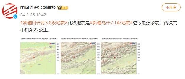 新疆阿合奇发生5.8级地震,此次地震是新疆乌什7.1级地震迄今最强余震,两次震中相距22公里。