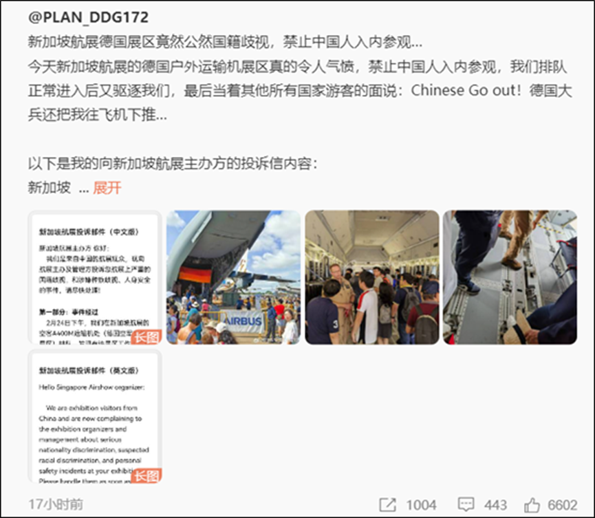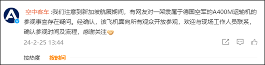 “新加坡航展期间一德国空军运输机拒绝中国籍游客参观”?空客官微回应