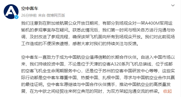 我们注意到在新加坡航展公众开放日期间,有部分到场观众对一架A400M军用运输机的参观事宜存在疑问。获悉此情况后,我们第一时间与相关各方进行沟通与协调,及时改进了参观流程,确保该架飞机面向所有到场观众开放。我们对此前现场工作造成的不便深表遗憾,感谢大家对我们的持续关注与反馈。