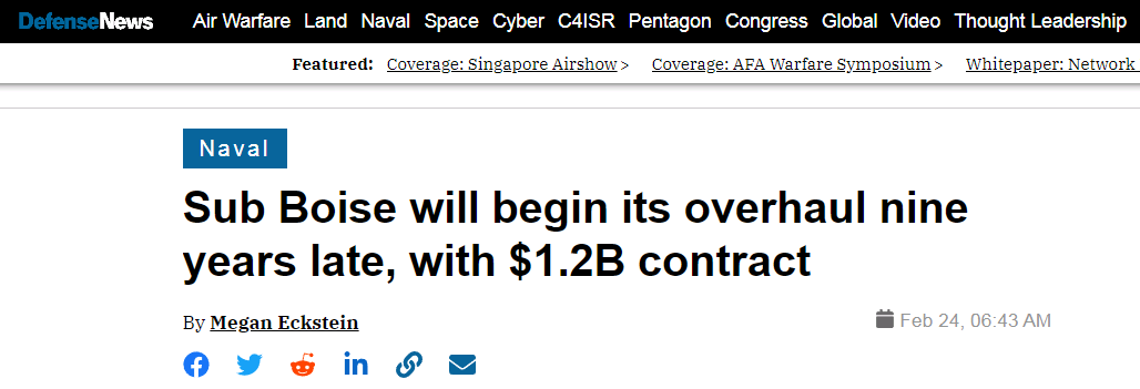 说到这艘核潜艇在码头上等待大修的艰辛过程,就连《防务新闻》也感叹不已——实在是太难了。报道描述称,“博伊西”号于1992年正式服役,原本也算得上美国海军核潜艇的主力,但它从2015 年以来就再也没有出海。“这艘潜艇一直在纽波特纽斯和附近的诺福克海军基地和诺福克海军造船厂之间来回穿梭,从来没有同时得到维修的空闲和为其提供维修的资金,这使得它成为过去十年美国海军战备困难的典型代表”。