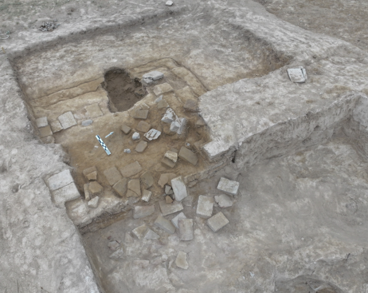 此外,考古队员在最大的房址发现方形砖砌祭台。专家表示,砖砌祭台属热水墓群中的首次发现,祭台中发现大量砖块。通过陵园及祭祀建筑的规模、数量等线索推测,这个墓葬的规格、墓主人的身份等级要高于2018血渭一号墓。