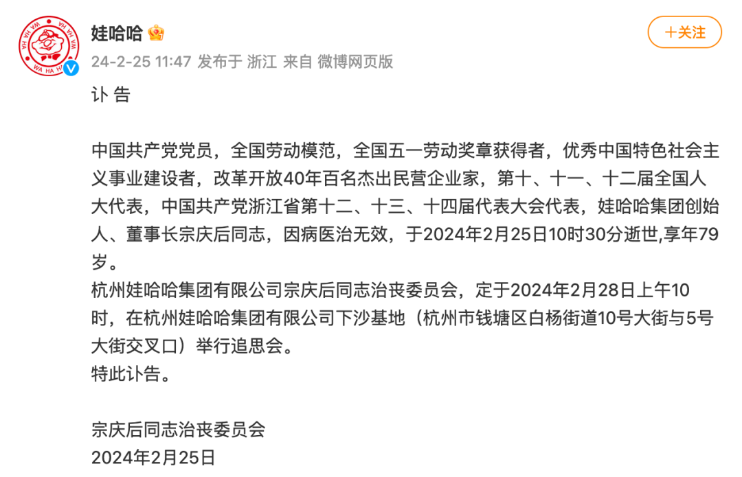 全国劳动模范、娃哈哈集团创始人宗庆后因病医治无效,2月25日10时30分在杭州逝世,享年79岁。2月26日,中华全国总工会致唁电表示:惊闻全国劳动模范、娃哈哈集团创始人、董事长宗庆后同志不幸逝世,深感悲痛。请向宗庆后同志的亲属转达我们的亲切慰问,并望节哀。