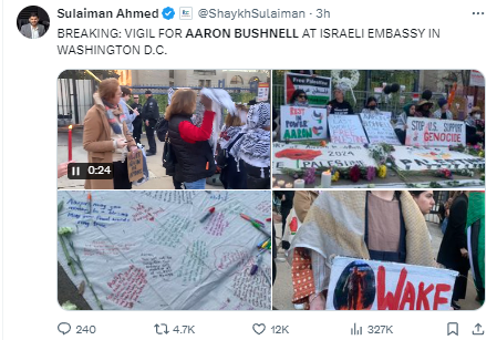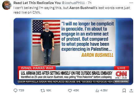 【环球网报道】当地时间25日,一名美国空军军人在以色列驻美大使馆外自焚后死亡,引发极大关注。综合多家外媒说法,该名美军是在用极端做法抗议以色列对加沙地带的军事行动。26日,英国《镜报》报道了这位名叫亚伦·布什内尔的男子在做出极端抗议行为前的“遗言”,他称自己“不会成为种族灭绝的同谋”,并表示与巴勒斯坦人的经历相比,“这(自焚)一点都不极端”。