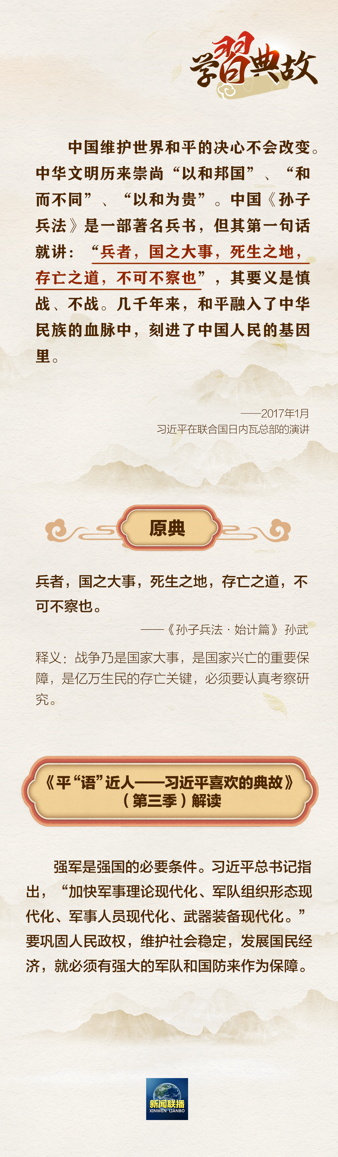 在党的二十大报告中,习近平总书记强调,“如期实现建军一百年奋斗目标,加快把人民军队建成世界一流军队,是全面建设社会主义现代化国家的战略要求。”围绕“强军之路”这一主题,总书记曾讲到哪些典故?一起学习↓↓↓