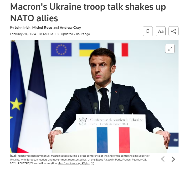 据报道,马克龙是26日在巴黎召开的欧洲领导人会议上发表上述言论的,会议的主题是如何提振对乌克兰的支持。