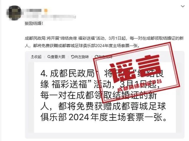 近日,有本地网民发帖称,成都民政局将开展“缔结良缘 福彩送福”活动,内容为“3月1日起,每一对在成都领取结婚证的新人,都将免费获赠成都蓉城足球俱乐部2024年度主场套票一张。”