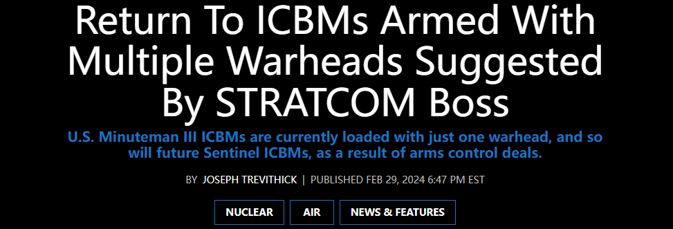 据美国“战区”网站2月29日报道,美国战略司令部司令呼吁“认真考虑”重新部署可携带多枚核弹头的陆基洲际弹道导弹。