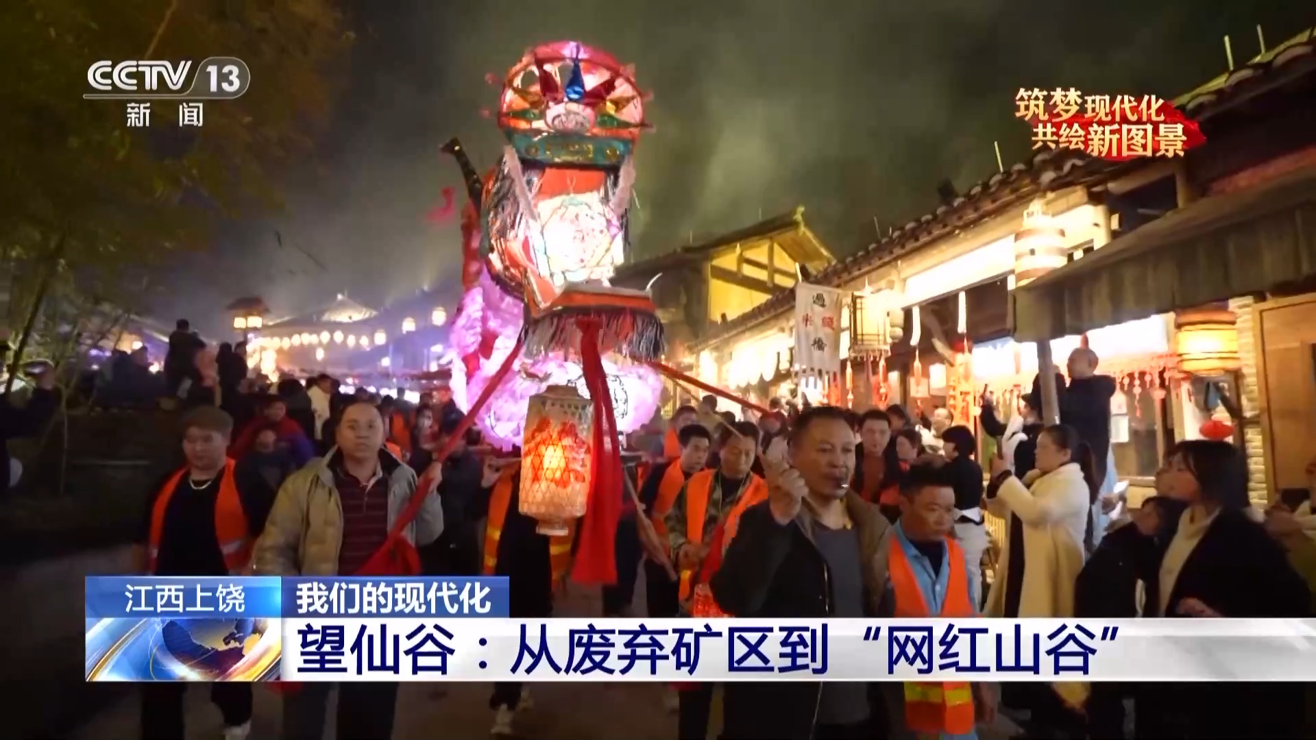 夜幕降临,伴随着锣鼓和烟花爆竹声,望仙谷内,村民们又抬起了板凳龙灯,百米长龙在村巷间穿梭摆动,游客也加入舞龙队伍中。