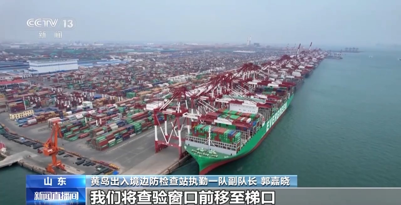 黄岛出入境边防检查站执勤一队副队长 郭嘉晓:在船舶入境前,我们通过网上预检申报,运用边检数据分析完成了船舶航行轨迹核查和船员行程排查。船舶到港后,我们将查验窗口前移至梯口,派出警力快速办理查验手续,实现船舶通关、作业“零等待”。