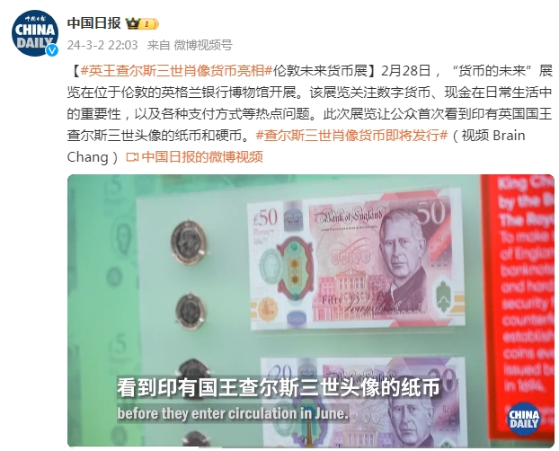 2月28日,“货币的未来”展览在位于伦敦的英格兰银行博物馆开展。该展览关注数字货币、现金在日常生活中的重要性,以及各种支付方式等热点问题。此次展览让公众首次看到印有英国国王查尔斯三世头像的纸币和硬币。