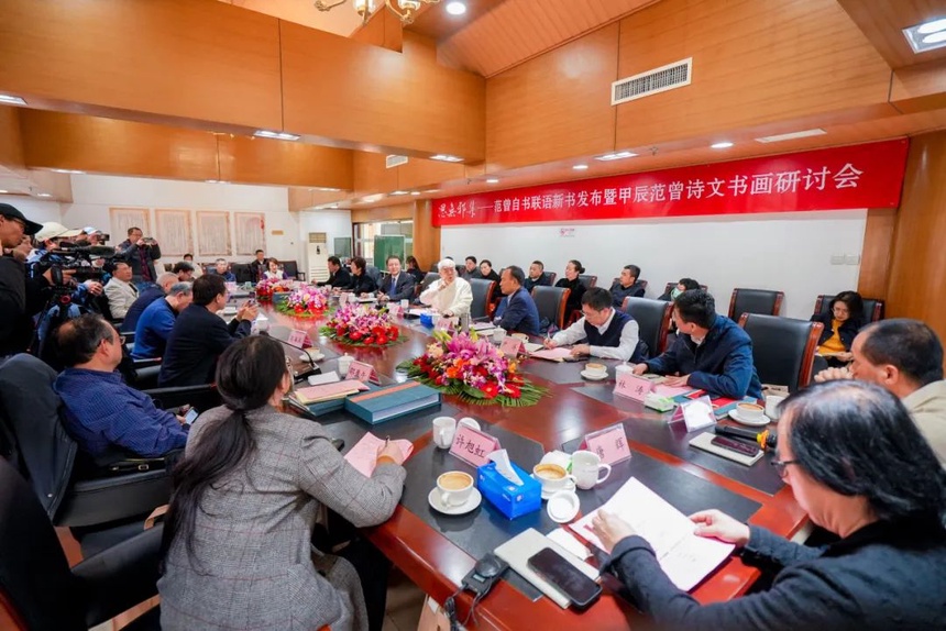 发布会当天还举行了“诗笺宝瑟墨醍醐——荣宝斋甲辰范曾诗文书画”研讨会,会议由中国艺术研究院一级美术师、博士生导师刘波主持。来自中华诗词学会、中国艺术研究院、清华大学、北京大学、南开大学、湘潭大学、江苏师范大学及中国电视艺术委员会等机构的众多专家、学者参加。