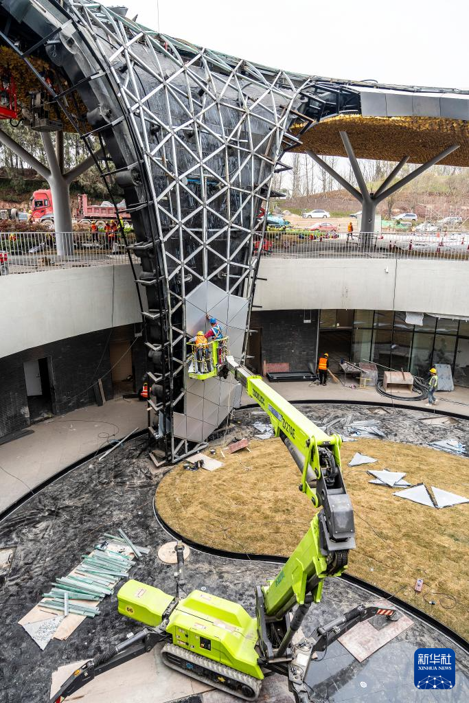 3月8日,项目施工方中建八局的建设人员在安装世园会主展馆下沉云台瀑布铝板。