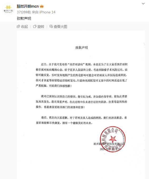 近日,关于我司发布的“高君雨患病”视频,本意是为了让大家看到君雨积极乐观对抗病魔的心态,给予更多人鼓励和力量。考虑到脑手术风险过高、病情可能反复,实时发布视频产生的舆论影响可能会对君雨家人和医院造成困扰我司才决定等病情稳定后错时发布。但最终视频配发时文案中的时间表述出现了严重纰漏,对此我们深感抱歉!