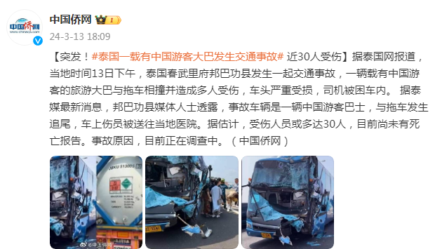 据泰国网报道,当地时间13日下午,泰国春武里府邦巴功县发生一起交通事故,一辆载有中国游客的旅游大巴与拖车相撞并造成多人受伤,车头严重受损,司机被困车内。据泰媒最新消息,邦巴功县媒体人士透露,事故车辆是一辆中国游客巴士,与拖车发生追尾,车上伤员被送往当地医院。据估计,受伤人员或多达30人,目前尚未有死亡报告。事故原因,目前正在调查中。