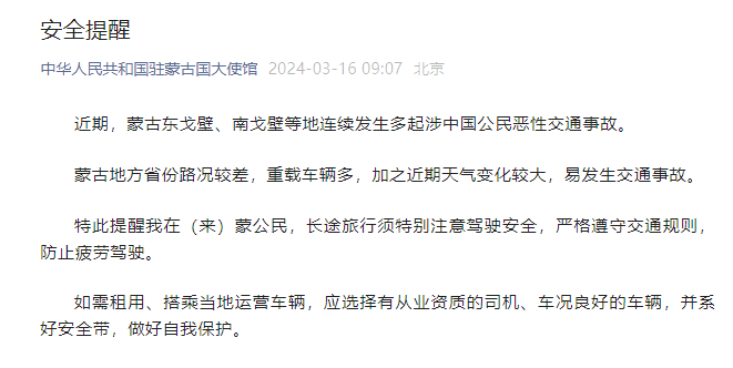 近期,蒙古东戈壁、南戈壁等地连续发生多起涉中国公民恶性交通事故。