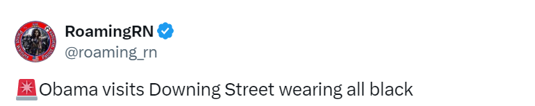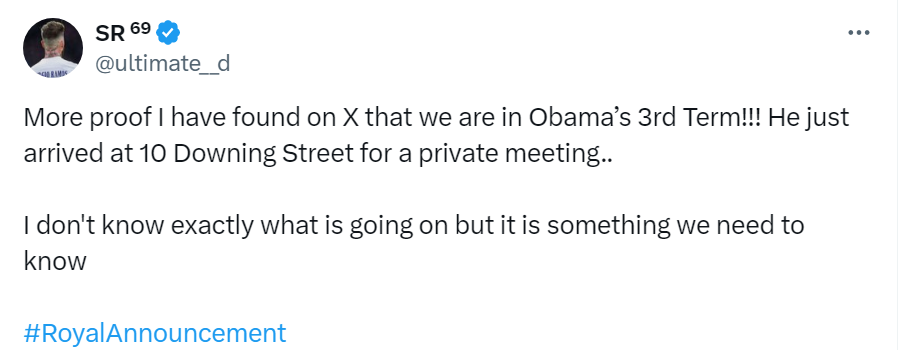 “我在X上找到了更多证据,证明我们正处于奥巴马的第三任期!!!他刚到唐宁街10号,准备参加一场私人会谈。我不知道到底发生了什么,但我们必须知道。”