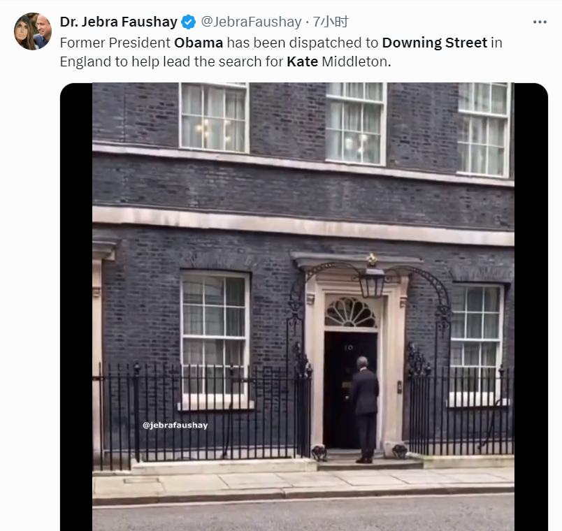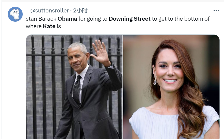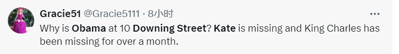“为什么奥巴马会出现在唐宁街10号?凯特失踪了,查尔斯国王也失踪了一个多月。”