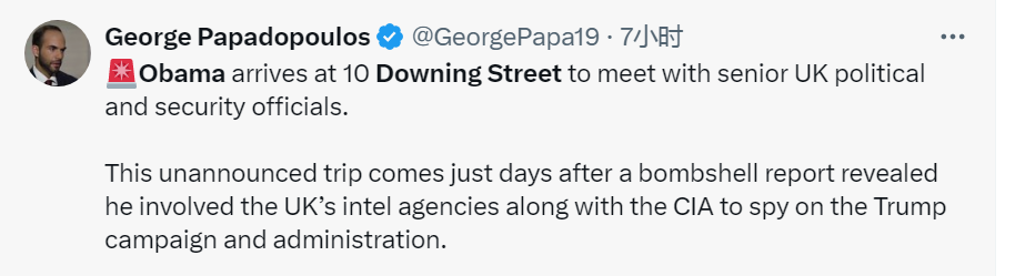 也有人提到,“奥巴马抵达唐宁街10号,会见英国高级政治和安全官员。就在几天前,一则令人震惊的报道披露,他参与了英国情报机构和美国中央情报局(CIA)对特朗普竞选和政府的监视。”有网友为此附和道,他“准备再来一次。”