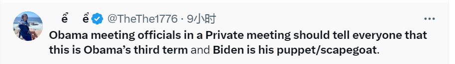 有X用户认为,这是奥巴马在寻求第三任期。“奥巴马在私人会议上会见官员应该是在告诉每个人,这是奥巴马的第三个任期,拜登是他的傀儡或是替罪羊。”