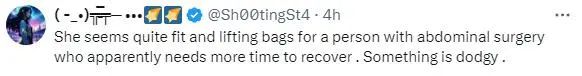 对于一个显然需要更多时间从腹部手术中恢复过来的患者来说,她看起来很健康,还能提袋子。这些事看起来不靠谱。