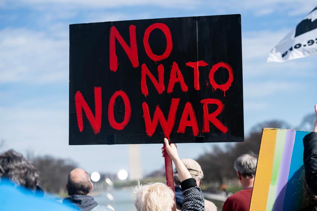2023年2月19日,在美国首都华盛顿,一名抗议者手举标语在林肯纪念堂前参加集会。“不要更多战争!不要更多战争!不要更多战争!”美国上千名反战人士当日下午在林肯纪念堂前举行集会,齐声高喊。新华社记者刘杰摄